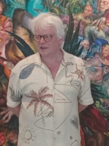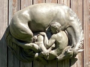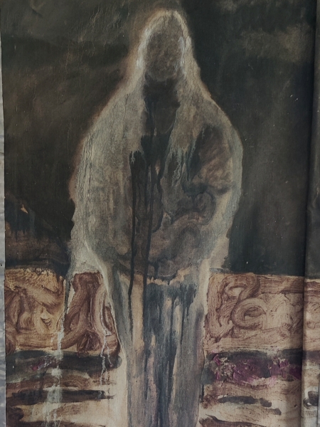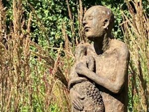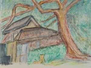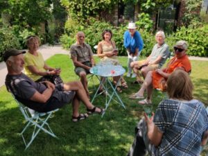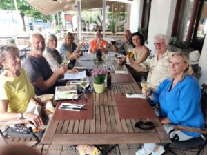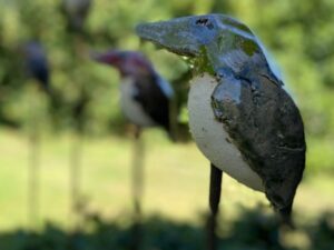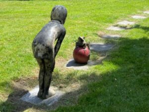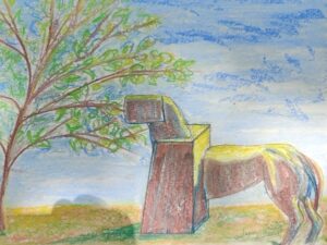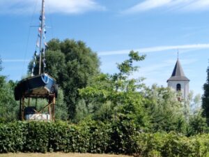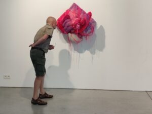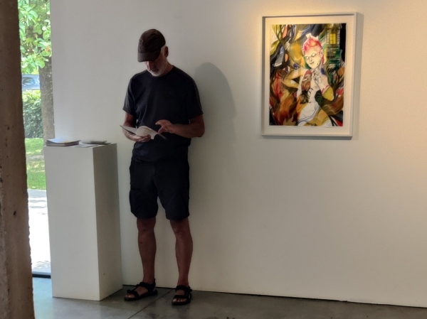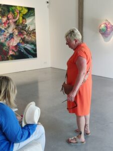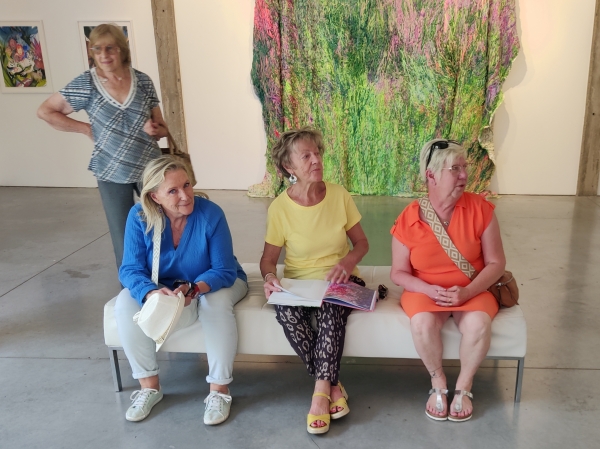 Iets voor elf parkeren twee wagens op de kleine parking voor de Verduyn Gallery. De galeriehoudster, Stefanie Verduyn, komt ons tegemoet en opent de poort. Ze gaat ons voor naar de grote zaal en geeft wat uitleg bij de werken die daar hangen en ook over haar filosofie bij het runnen van deze bijzondere plek. Meer dan louter een galerij, een uitnodiging om de confrontatie aan te gaan met eigentijdse kunst. Dank u Stefanie! Maar wij zijn gekomen om te werken en aan inspiratie geen tekort in deze beeldentuin. Na twee uur geconcentreerd schilderen, tekenen of digitaal een beeld creëren is het verzamelen geblazen en wandelen we te voet naar het restaurant DUEL Moregem – De Vierschaar. Buiten eten, smaakvol en gezellig. We betalen onze schulden en -genietend van het landschap- keren we terug naar de galerij. We bezoeken nu alle ruimtes en krijgen op het einde een welgekomen glas water. Tijd om te vertrekken…